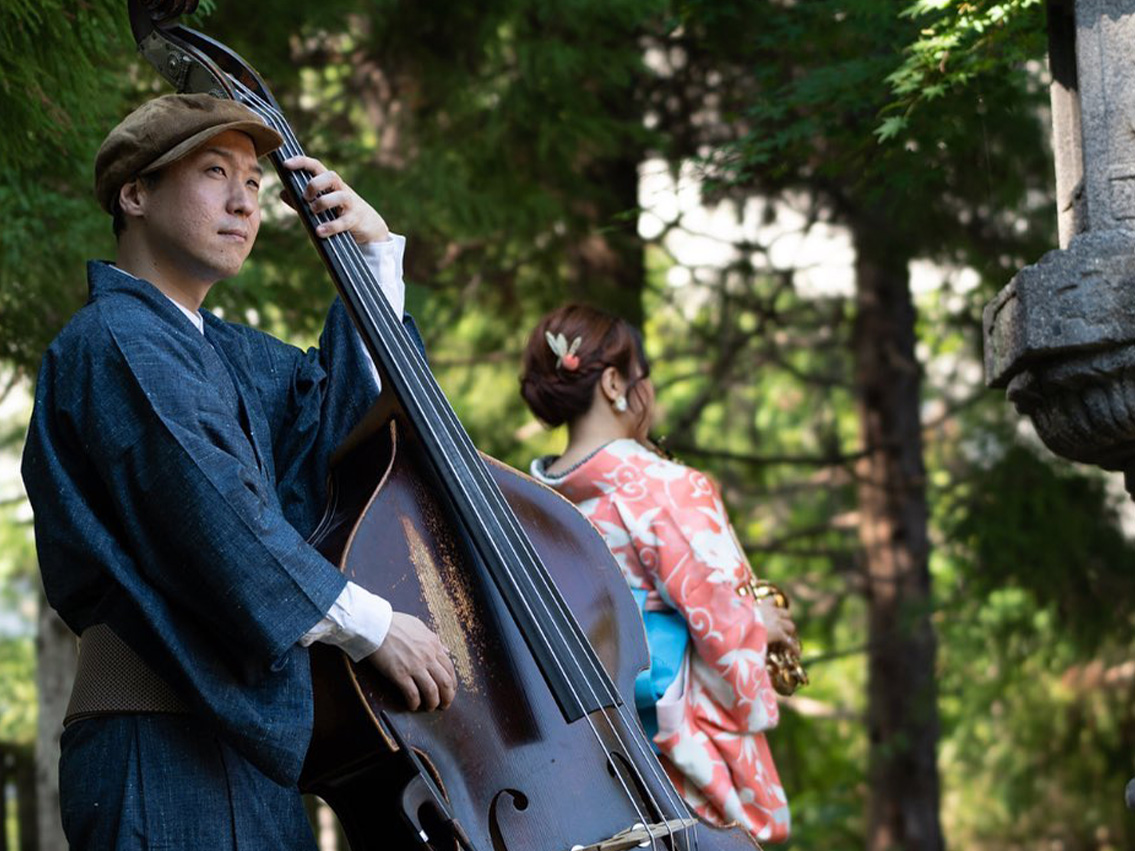 山口県出身でコロナ禍のためNYより帰国中のベーシスト権上康志のもとに東京・大阪より日本屈指のミュージシャンたちが集い、萩市が誇る「明倫学舎」と「松陰神社・立志殿」で着物を身に纏い演奏するスペシャルコンサートが開かれます。日本文化とジャズのコラボレーションの特別な時間をお楽しみください。