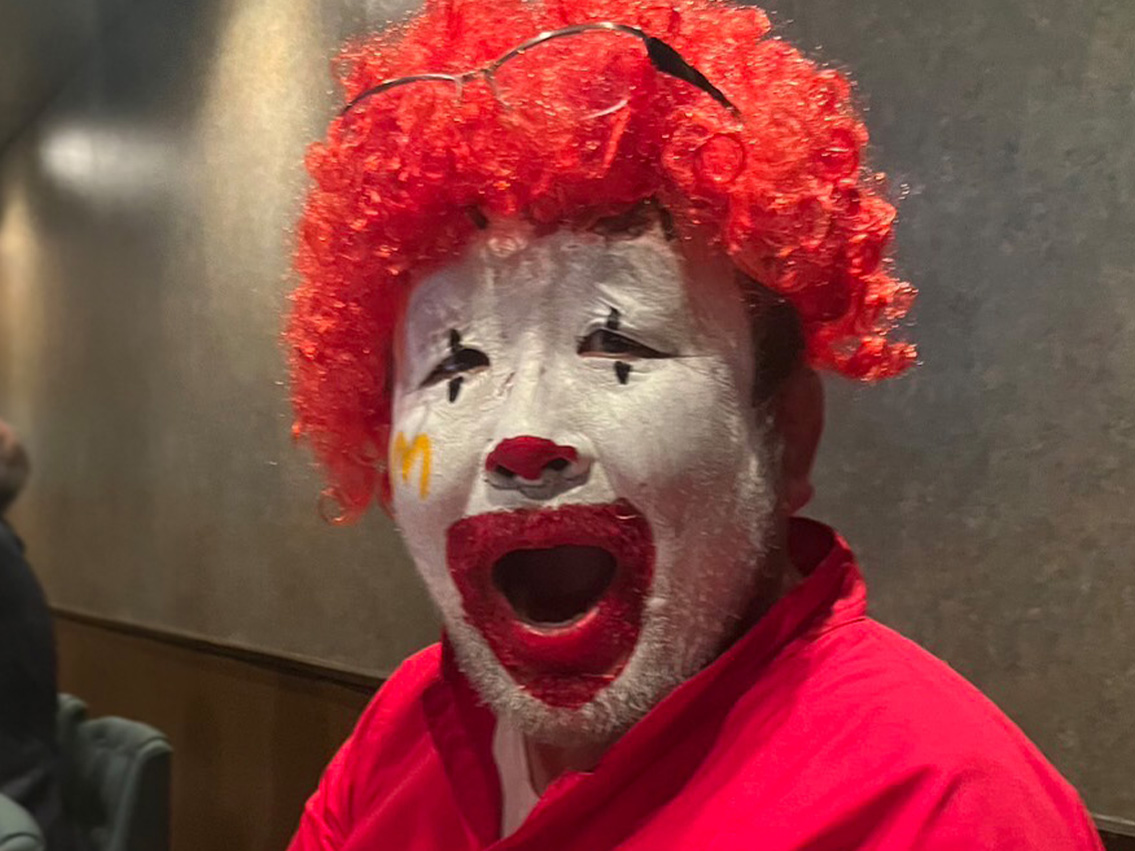さて、みなさんのウチではハロウィンをお祝いしたり楽しんだりされました?ワタクは結婚前からの活動でコスプレして夜の街を練り歩くという事をやっており、理解のある奥さんは寛容な心で見守ってくれているのです。今年は10月29日の土曜日に繰り出しました。だいたい炭火居酒屋華さんで家族で食事をして、ワタクシだけで次のお店に行くんですね。本年のコンセプトはドナルドマクドナルド。そう、マクドナルドのキャラクターです。娘が、インスタやユーチューブのショート動画が好きでよく見るんですが、たまにドナルドマクドナルドの動画が出るんです。で、キャッキャとはしゃぐ姿を見て決めたんですね。