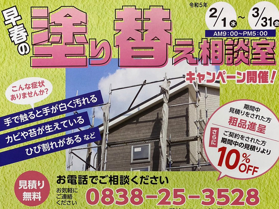 2月の上旬より早春の塗り替え相談室を開催しております。今回は美祢地区を新たに加えて、カラーでの広告作成をさせてもらいました。多少費用はかかってしまいましたが(汗)