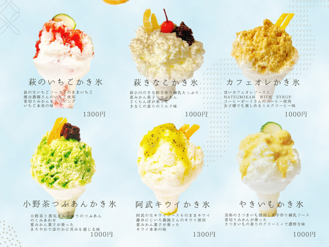 蒸気まんじゅうと夏みかんの皮菓子の製造販売を行っている(有)中村製菓本舗さんが、4月15日に「贅沢生かき氷シリーズ」を新しく発売されました。中村製菓本舗では、肌寒い季節に蒸気まんじゅうが大人気です。暑い夏場にもお客様に喜んでいただきたいという思いから昨年発売を開始したのが、ぷるぷるシャリもち食感が楽しめる夏みかんの果肉入り「くずバー」と、かき氷でした。萩の夏みかんの魅力を多くの方に味わっていただきたいと考えていらっしゃる中村さんは、昨今のパフェ状の高級かき氷ブームの流れもあり、今年は自分たちもお客様も満足できる贅沢かき氷を作りたいと、野菜ソムリエでありヤサイコトバ作家の西川満希子氏と共同開発に挑まれました。榎谷農園さんのいちごをそのままソースにした萩いちごかき氷や、阿武町産のキウイかき氷、美祢市村上農園さんのさつまいもを使ったやきいもかき氷など、萩や山口県内の厳選した産品を使用。イチオシは萩の夏みかんかき氷で、ほろ苦い夏みかんソースと夏みかんの皮菓子・くずバーが乗った贅沢な一品です。萩を訪れた方に夏の思い出として楽しんでもらうために、かき氷のフルーツソースはお客様の目の前でブレンダーを使用し仕上げるなど、提供までの演出にもこだわっています。