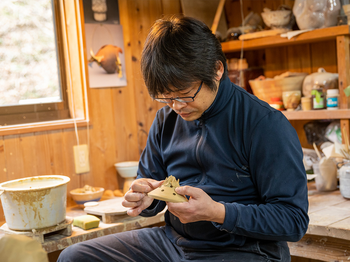 -高校卒業後、東京造形大学で彫刻科を専攻し、大学卒業後は京都に移り、京都府立陶工高等技術専門校、京都市工業試験場陶磁器専修科で陶芸を学びました。20代後半に萩に帰ってきてからは、父・裕に師事し、家業に就きました。それまで東京と京都という大都会で学んでいたこともあり萩という田舎との違いであったり、素人と作家の違いなど、家業に就いてからは、そのギャップに色々悩んだ数年間がありました。そこから、岡田窯が築いてきた歴史や萩焼という文化を、しっかり見て、自分なりのものを生み出してやっていこうと、今まで研鑽を積んできたつもりです。伝統工芸展や公募展を中心とした作品を発表する場で活動しながら、あるいは百貨店やギャラリーで個展、グループ展を開催し、北海道から九州まで全国各地に出向いていき、それぞれの土地の特色や萩との違いを体感することで、インスピレーションを受け、作陶に繋げることができました。また、全国各地で作品を発表することで、制作した作品のアイデンティティーを感じることができもしましたし、逆に、自分がこの萩でどのようなことをしたいか、どういうことをすべきかということを考えるようになりました。そうやって私の萩焼作家としての形を作ることができ、今に至るといった感じです。