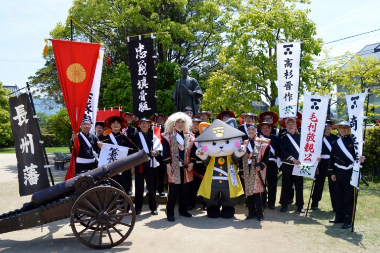 その奇兵隊士が5月5日(月・祝)萩城下町に参上します!白壁となまこ壁の美しい菊屋横町などをパレードします。パレードの途中 、晋作広場で、奇兵隊士や萩市観光課長代理「萩にゃん。」と一緒に記念撮影ができます。